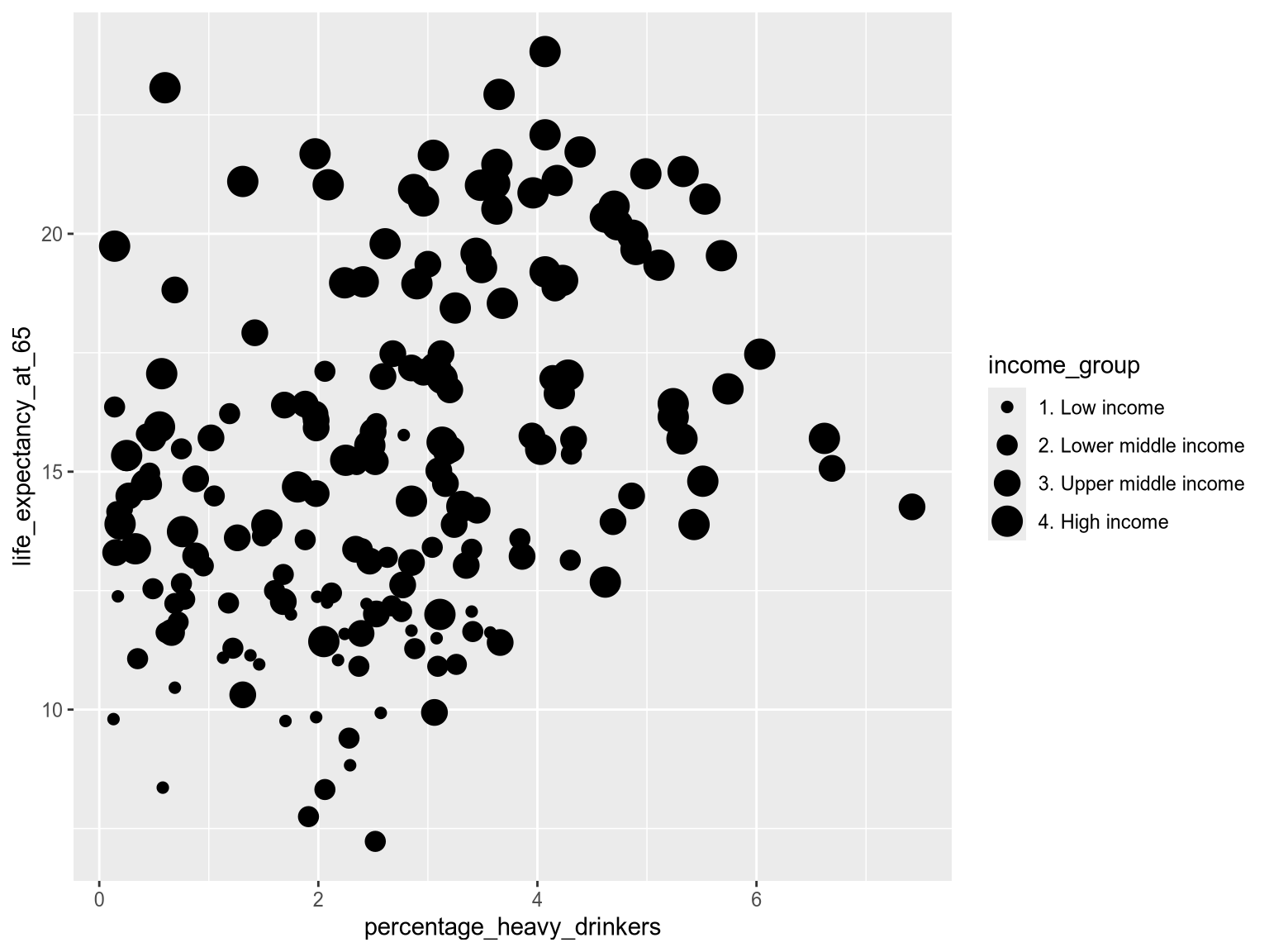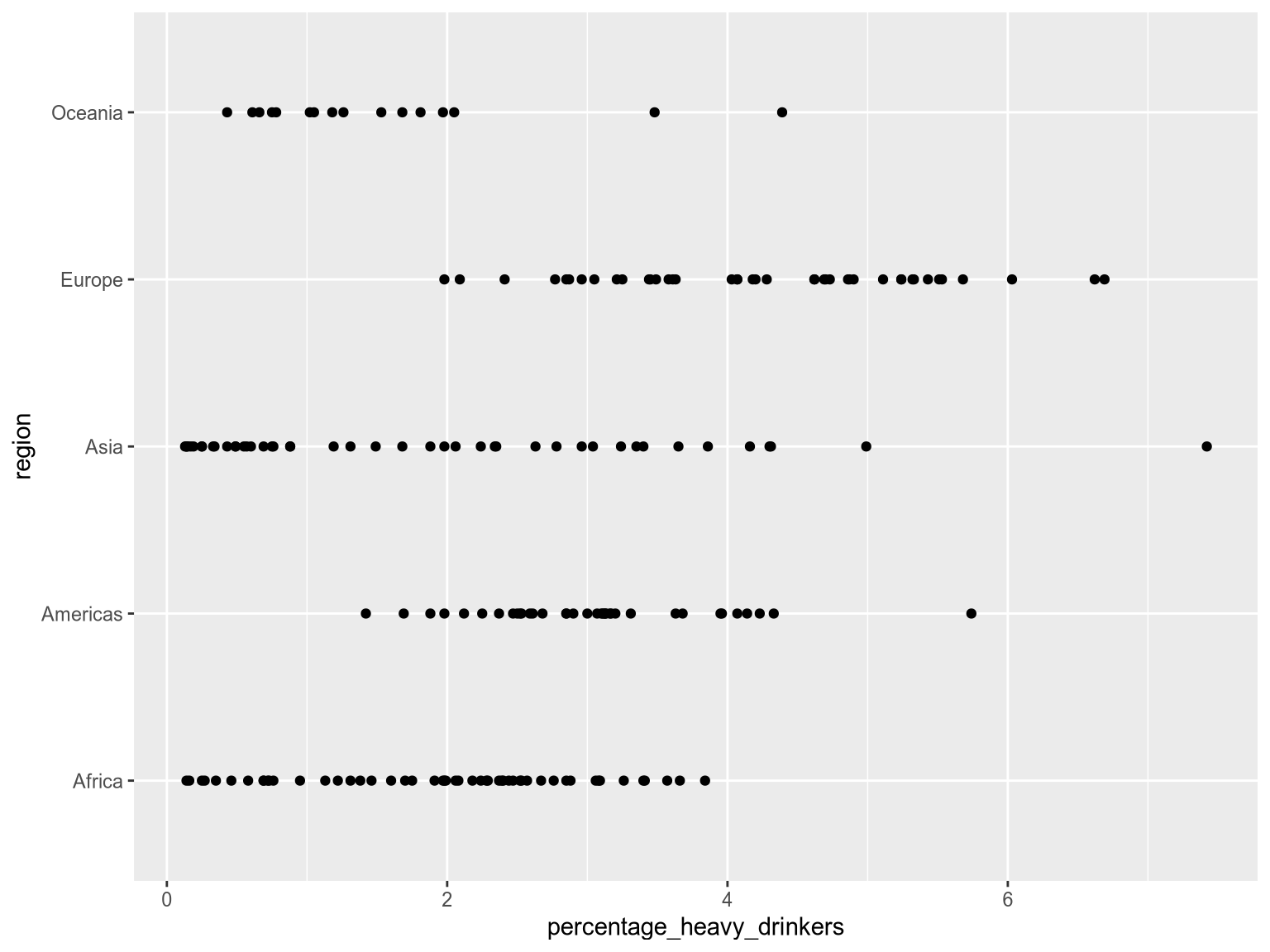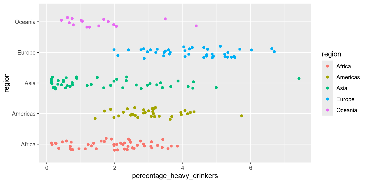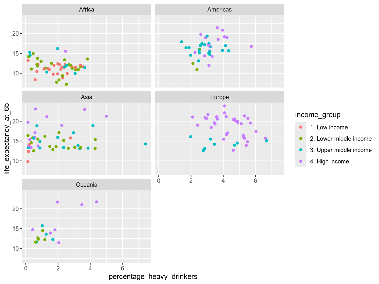 As you can see above, faceting makes it easy to observse the overall shape of the distribution for each income group and how tightly clustered the values are. It also reveals potential outliers in the Upper Middle Income facet – we can easily spot two countries with a higher percentage of heavy drinkers. On the other hand, it is now harder to compare the exact values between two groups because the points are spread out in different charts, instead of right next to each other in a single chart.