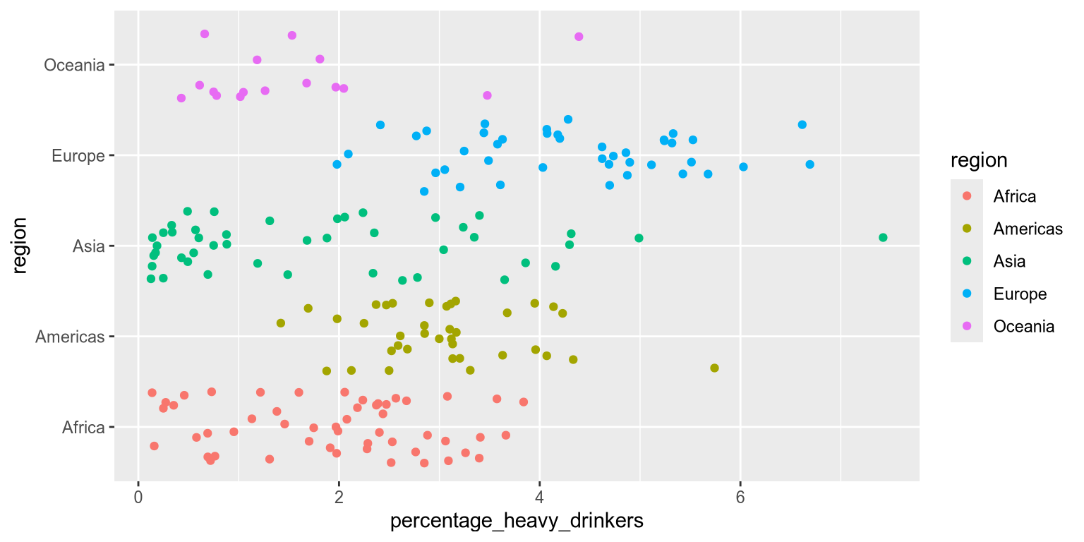 If we are interested in comparing groups for a single continuous variable (such as percentage_heavy_drinkers above), position is often the most effective grouping method. If we are interested in comparing groups while visualizing a pairwise relationship between two continuous variables