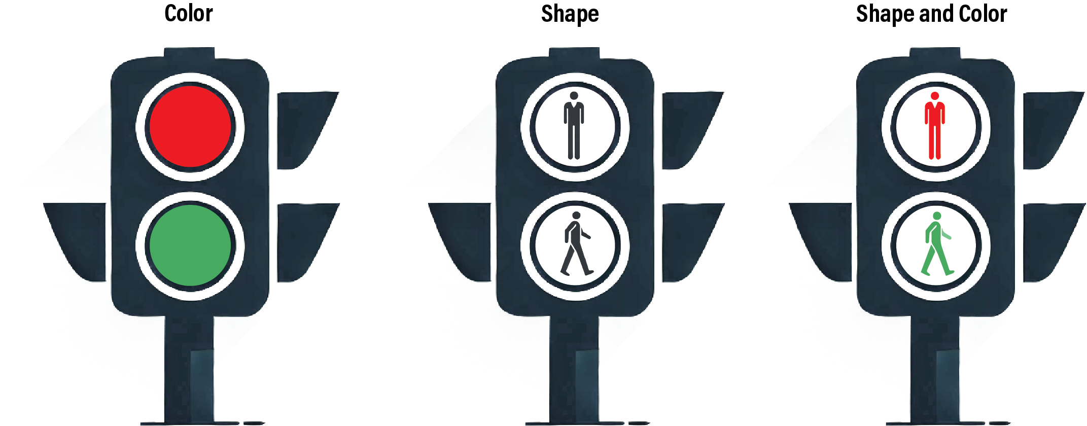Do you think that traffic lights are well designed? At first glance, they break a major rule of accessibility, using the worst possible color combination for people with red/green color vision deficiency. Thankfully, in many countries, traffic lights are encoded using both position (vertically along the “y-axis”), color, and shape.